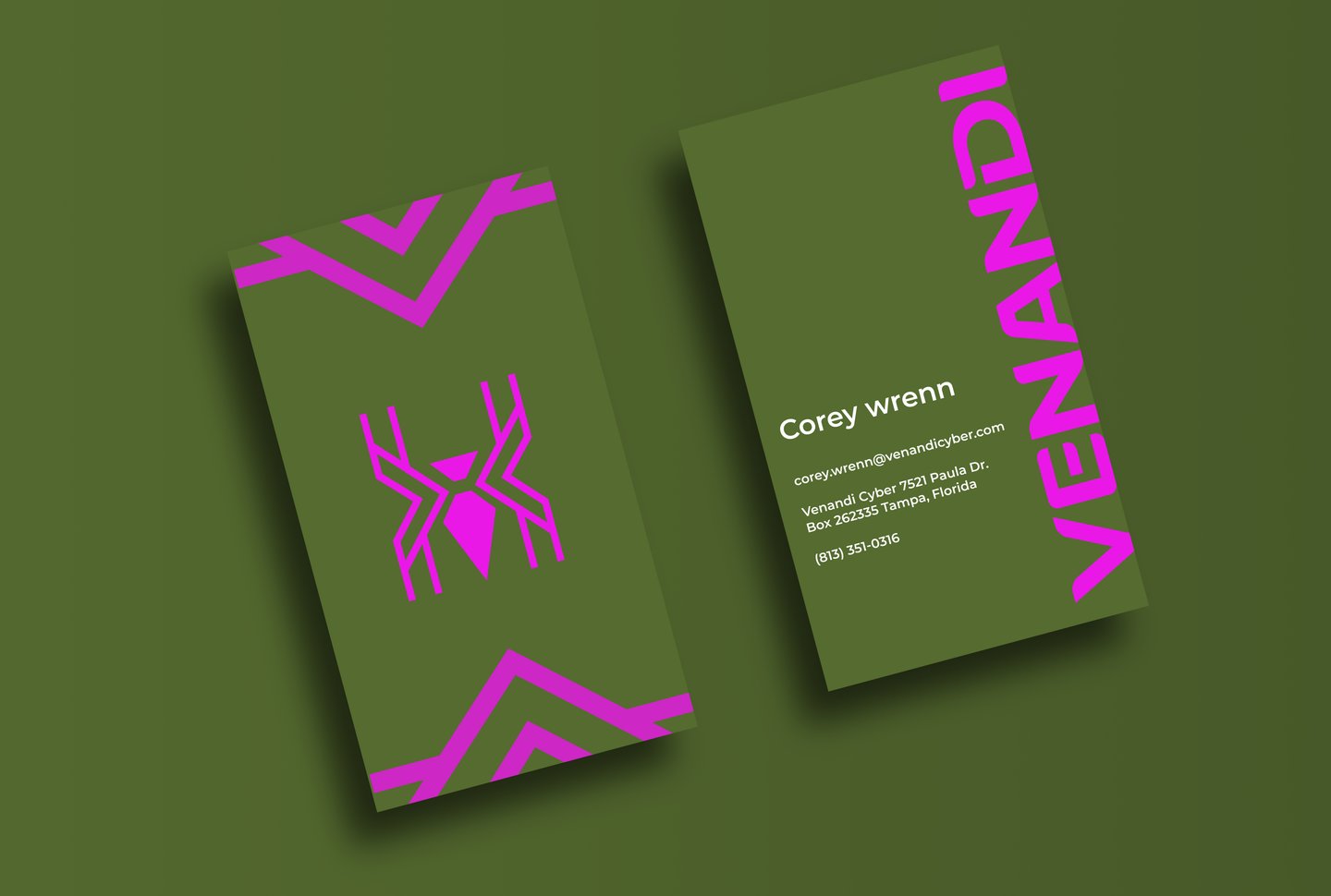 For the logo, a spider was chosen because of its hunting style. Research shows that spiders set traps for their prey and also, they randomly search for prey. This is a pre-emptive approach to mitigating risks(something Venandi is passionate about). And oh, Venandi is Latin for hunting.